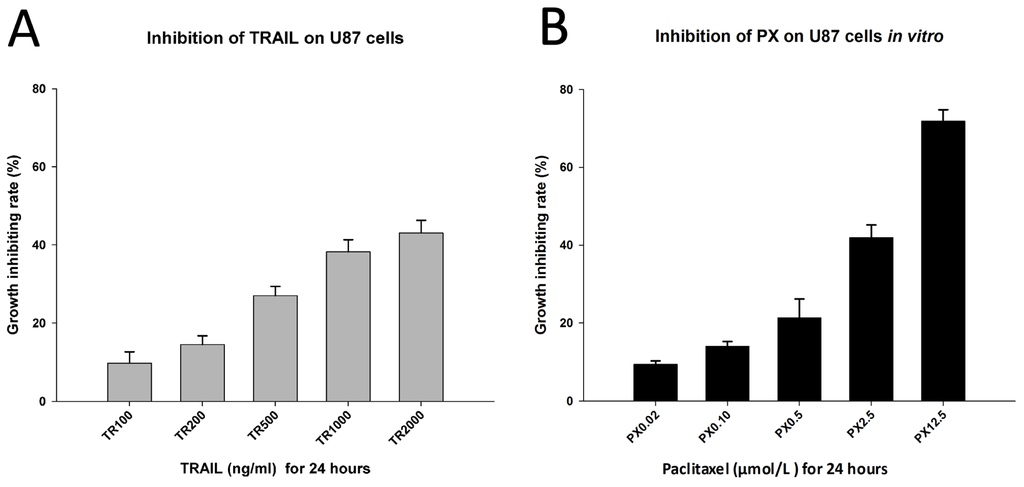As expected, both TRAIL and PX demonstrated an inhibitory effect on U87 cells in vitro in MTT assay. We observed that TRAIL inhibited U87 cells in vitro when its concentration was more than 100 ng/mL, and the inhibiting effect was concentration-dependent. Nevertheless, there was no significant difference in the growth-inhibiting rate when the concentration of TRAIL reached 1000 ng/mL or 2000 ng/mL, suggesting that TRAIL has achieved its saturated concentration at 1000 ng/mL (Figure 3A). PX also exhibited an inhibiting effect on U87 cells in vitro in a concentration-dependent manner. PX inhibited U87 cell growth in vitro when its concentration was 0.02 μmol/L, and the growth-inhibiting rate increased with higher concentrations. When the PX concentration was increased to 12.5 μmol/L, its growth-inhibiting rate was over 70% (Figure 3B).