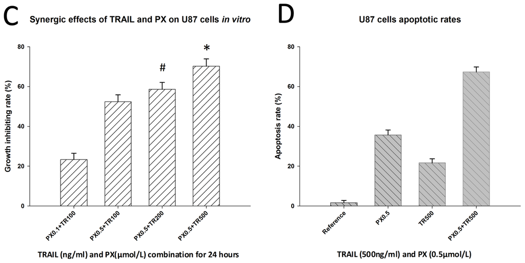 (A) and (B) In an MTT assay, TRAIL or PX alone inhibited U87 cells in vitro in a concentration-dependent manner; (C) The synergic effect of TRAIL/PX on U87 cells (# CDI = 0.83; * CDI = 0.59); (D) Flow cytometric apoptosis assay.