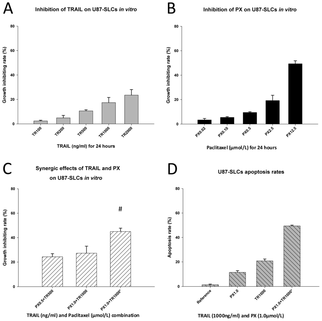 (A) TRAIL weakly inhibited U87-SLCs; (B) A high concentration of PX showed a relatively high inhibitory effect on U87-SLCs; (C) No synergy occurred when U87-SLCs were treated simultaneously with TRAIL and PX after 24 h. However, a modified administration scheme was synergic (# CDI = 0.80); (D) Flow cytometric apoptosis assay.