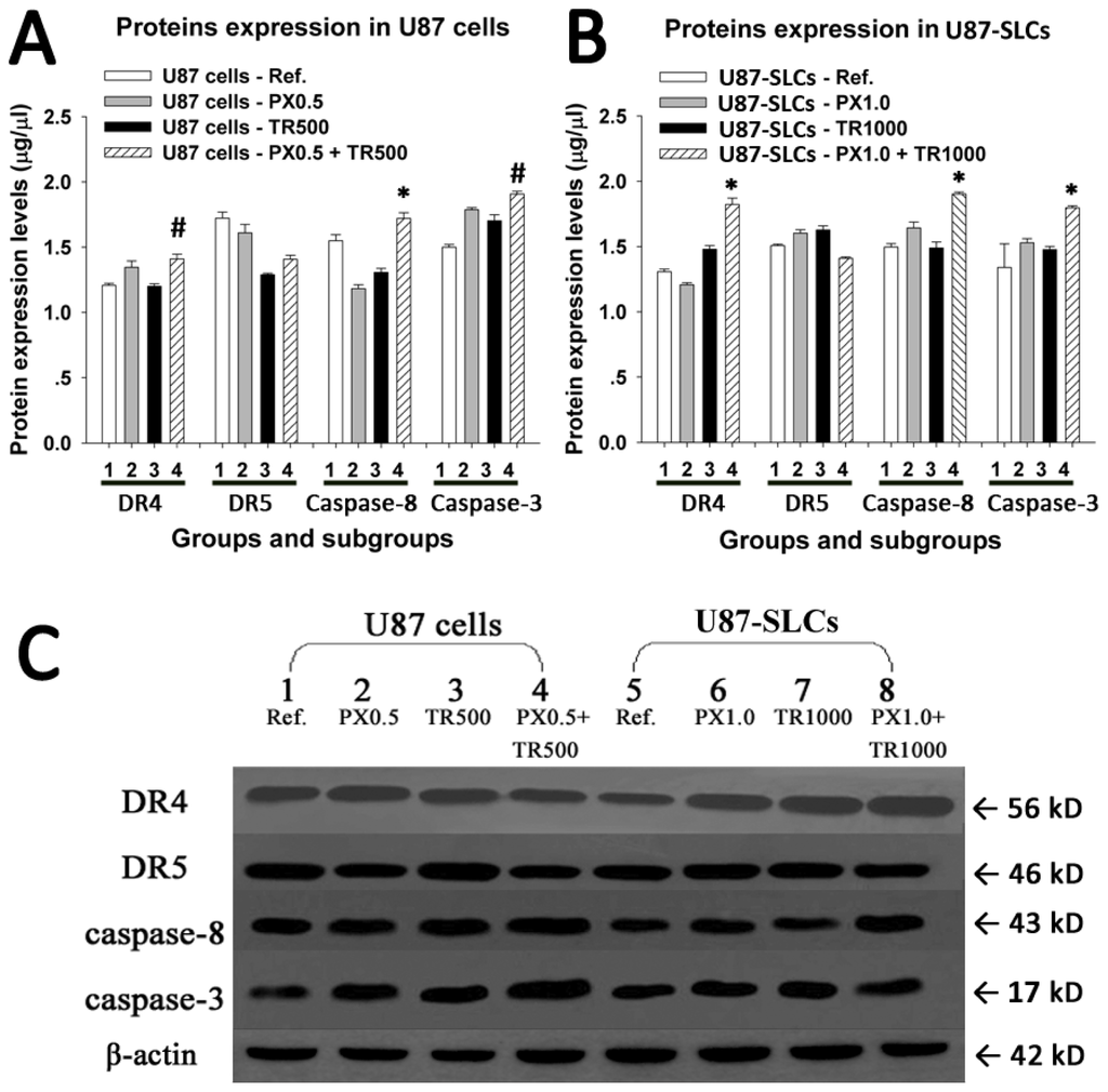 (A) and (B) In the TRAIL/PX combination treatment with synergy, significantly higher expression levels of DR4, cleaved caspase-8 and cleaved caspase-3, but not DR5, were observed by quantitative analysis (# p < 0.05; * p < 0.01) either in U87 cells or U87-SLCs; (C) Upregulation of DR4, cleaved caspase-8 and cleaved caspase-3 in the TRAIL/PX combination treatment with synergy was visualized by Western blot.