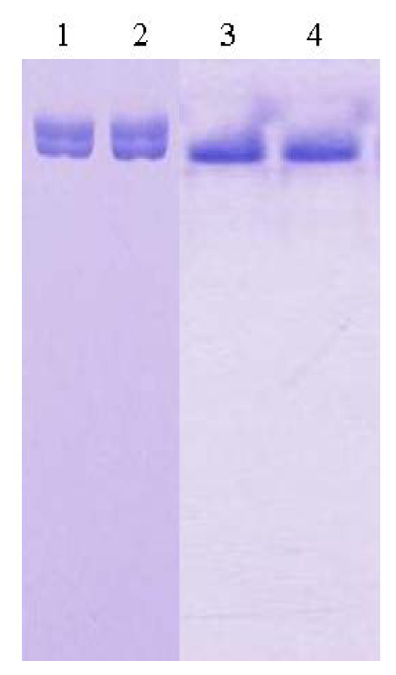 Native-PAGE of purified recombinant L2 lipase. Lanes 1 and 2: L2 lipase purified through Ni-Sepharose affinity column chromatography; Lanes 3 and 4: L2 lipase purified through Ni-Sepharose affinity column chromatography and Super-Q ion exchange column chromatography.