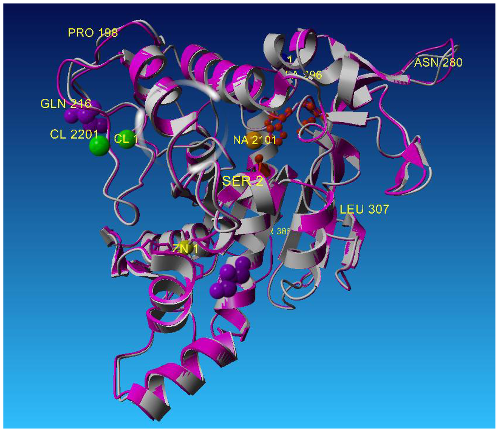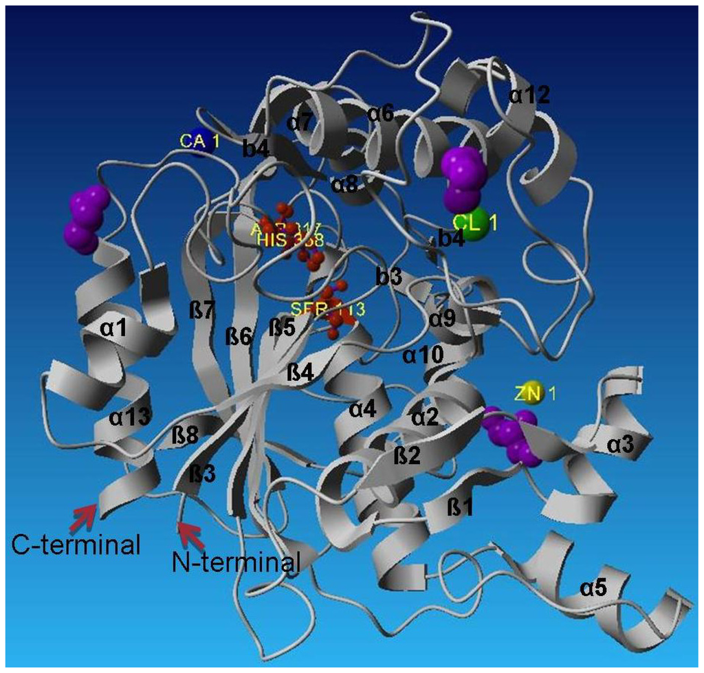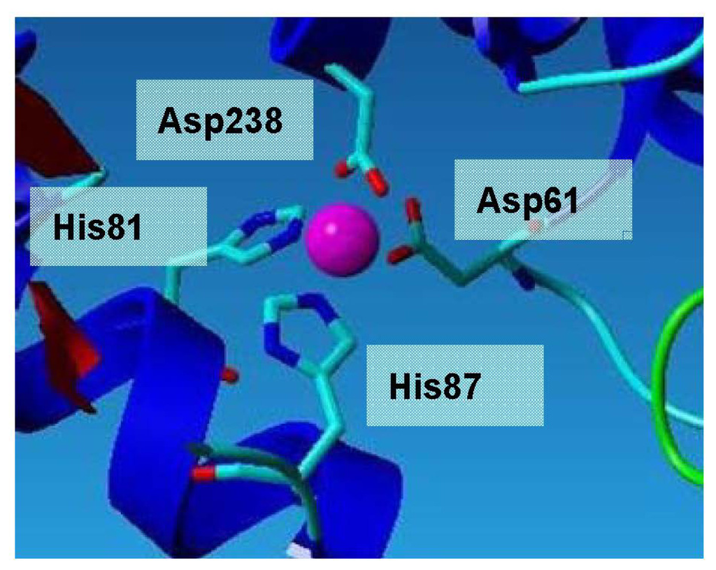 The Zn2+ is coordinated in a tetrahedral environment by two histidine N12 atoms (His81 and His87) located in helix α3, and two aspartate O atoms (Asp61 and Asp238) (Figure 6). All zinc-ligand distances are between 2.0 Å and 2.2 Å, which are as expected for zinc. The Zn2+ is approximately 19 Å away from the catalytic serine residue, and is thus unlikely to participate in catalysis. Instead, it could be suggested that it plays a role in conferring enhanced stability [12]. The zinc-binding motif consists of two histidines and two aspartic acid residues.