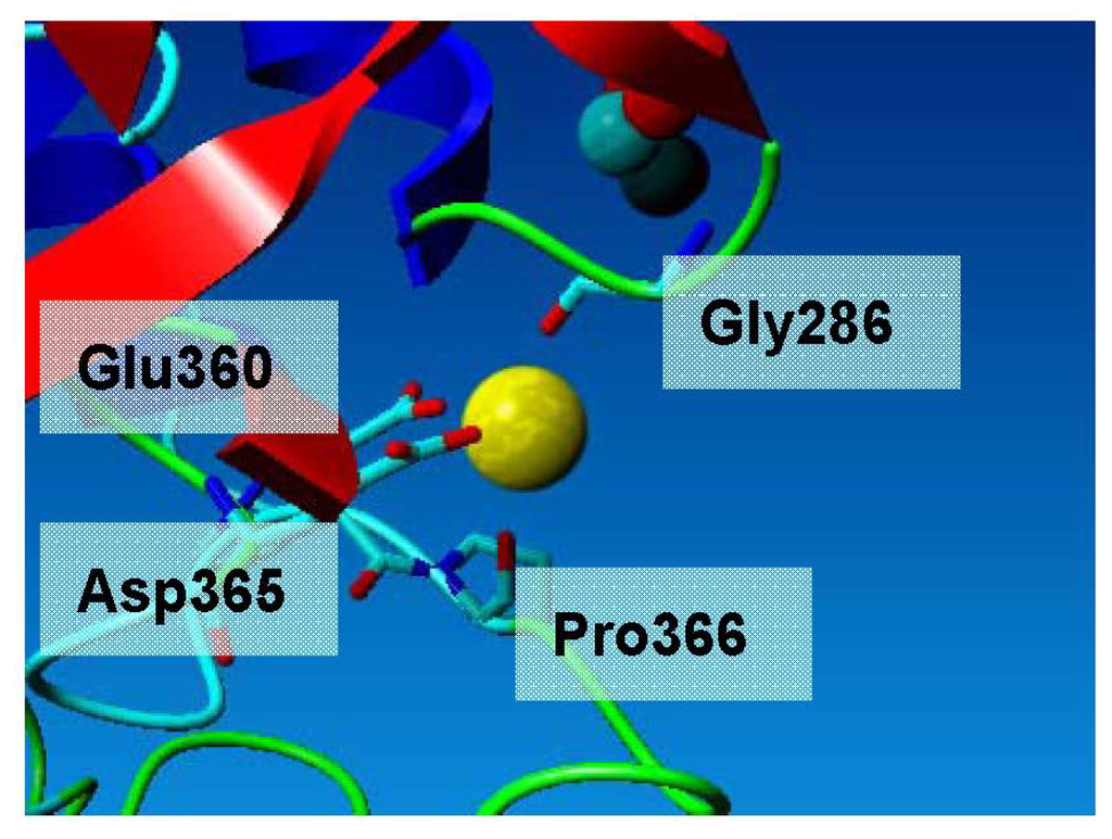 L2 lipase crystal structure Shape 2 revealed the presence of Ca2+ and Zn2+ attached with its molecule. L2 lipase has a structural motif of Ca-binding EF-hand. The shape was perceived as a hand with extended fingers that cups the Ca2+ [14]. A typical Ca-binding EF-hand motif is coordinated by a backbone oxygen, a water atom, two carbonyl oxygen atoms of Asp residues, the amide oxygen of Gln residue and the forked carboxyl group of glutamate residue. The interactions are a quite complex mixture of ionic and polar dipole interactions, and although there are seven atoms around calcium, distances indicate that the bifurcated contact to the Glu residues has a large ionic component, with the sixth corner of the octahedron presenting the point of highest negative partial charge density. In the L2 lipase structure, the Ca2+ is coordinated in an octahedral environment via Gly286 O, Glu360 O Asp365 O, Pro366 O and two water molecules (Figure 5). All calcium–ligand distances are approximately 2.4 Å, which is in accordance with reported values.
