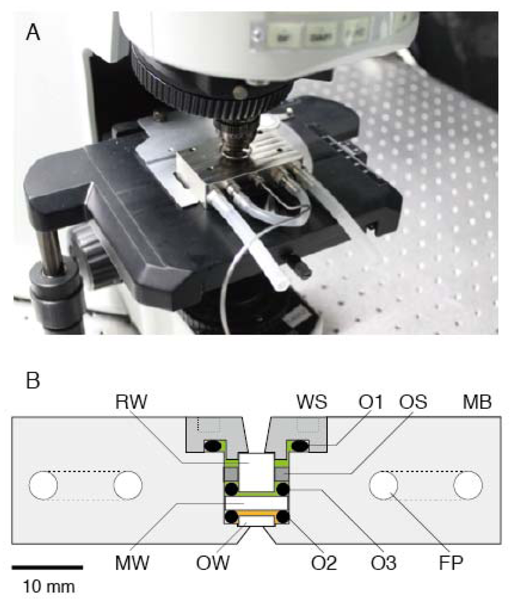 The miniature chamber was combined with a commercially available upright microscope (BX51; Olympus, Tokyo, Japan) on a vibration-free table (AS-II 1510TM; Nippon Boushin Industry Co., Shizuoka, Japan). The chamber was settled on the microscope stage with a conventional slide holder (Figure 1A). Microscopic observation was done by a long-working distance objective lens (OL; NA 0.6, WD 3 mm, LUCPLFLN40×; Olympus). Bright-field and epifluorescence images were acquired without any modifications (data not shown).