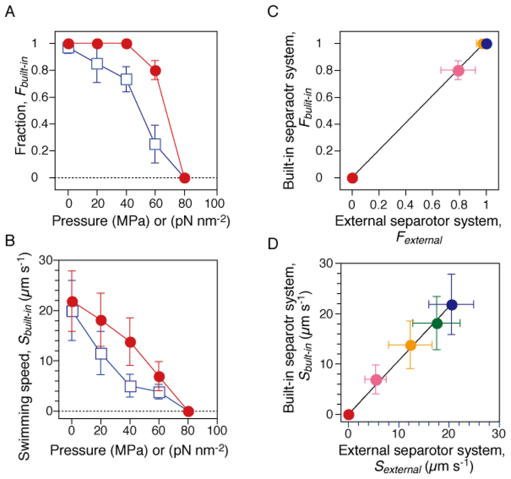 Motility of smooth-swimming cells. The motility assay was performed by two different systems. The current high-pressure chamber was equipped with a “built-in” separator, in which water pressure was properly transduced to that of the sample solution (See Section 3.1). On the other hand, the previous one was equipped with an “external” separator []. (A and B) Swimming fraction and speed during the pressurization (closed circles) and depressurization processes (open squares). Swimming fractions, Fbuilt-in, were based on the number of cells that swam with a speed of > 2 μm s−1 at each pressure. The speed, Sbuilt-in, was the average value of the swimming cells in A. Error bars are the SD. (C and D) Correlations between the results measured by “built-in” and “external” separator systems. The swimming fraction (C) and speed (D) at 0.1 (blue), 20 (green), 40 (yellow), 60 (pink) and 80 MPa (red). The plots in C and D were fitted to lines with slopes of 1.02 ± 0.01 and 1.07 ± 0.02 (± fitting error), respectively.