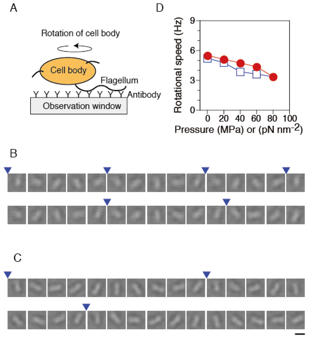 In summary, we demonstrated a motility assay of single flagellar motors at high pressure, and characterized the pressure dependence of the motor rotation in E. coli cells. The present technique could be combined with other advanced microscope techniques [–]. High-pressure microscopy will be extended to study not only the flagellar rotation, but also other cellular processes [,,].