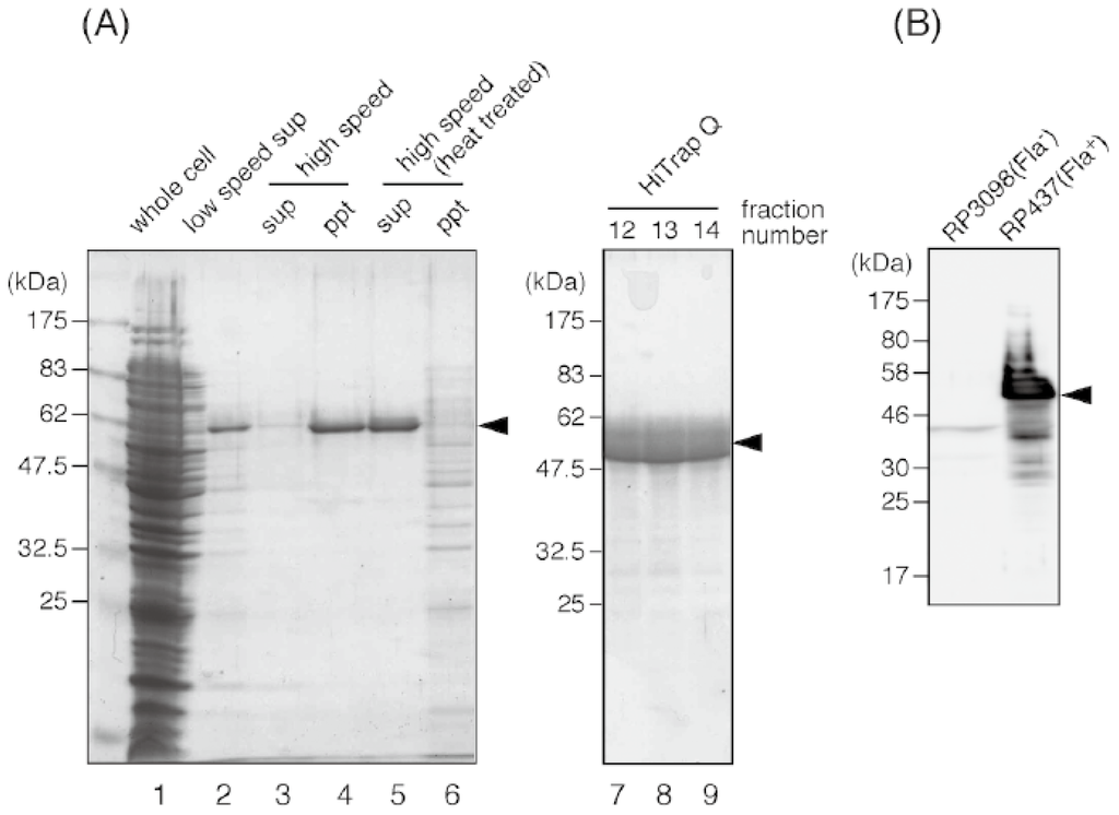 The supernatant was ultracentrifuged at 101,500g for 1 h to precipitate flagella (Figure 4A, lane 4). The pellet was suspended in 20 mM Tris-HCl (pH 8.0) and heated. When the temperature reached 75 °C, the suspension was further incubated for 15 min, then immediately cooled down by ice-cold water. After this heat treatment, the depolymerized, soluble flagellin was separated from insoluble materials by ultracentrifugation (101,500g for 1 h, Figure 4A lane 5). Flagellin was further purified by using an anion-exchange column (HiTrap Q, GE Healthcare Japan, Tokyo, Japan) and eluted with a linear 0 to 300 mM gradient of NaCl. Peak fractions (Figure 4, lane 7 to 9) were collected and concentrated to 11 mg/mL by ultrafiltration using an Amicon Ultra device (Millipore, Billerica, MA, USA). At this final stage, flagellin was more than 90% pure and appeared as a main single band on the SDS-PAGE gel. The band corresponding to flagellin was excised and the protein was extracted from the gel by crushing it, then mixed with adjuvant and injected into rabbits for immunization.