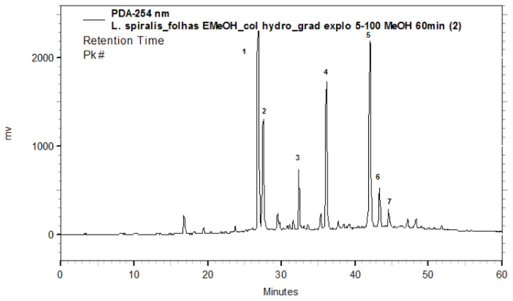 The chromatographic profile of the methanolic extract of the leaves from L. spiralis was obtained by using a Jasco (Tokyo, Japan) liquid chromatograph equipped with a PU-2089 Plus pump, a MD-2010 Plus Photodiodo Array detector (PAD) and a Rheodyne 7725 sample injector with a 20 μL sample loop. The analytical column was a Phenomenex Synergi Hydro RP18 (250 × 4.6 mm i.d.; 4 μm) equipped with a Phenomenex security guard column (4.0 × 2.0 mm i.d.). The mobile phase composition was methanol. The gradient program was as follows: 5%–100% methanol in 60 min. The flow rate was 1.0 mL/min and the total run time was 60 min. The software EZChrom Elite 3.17 was used for control analytical system, data collection and processing.