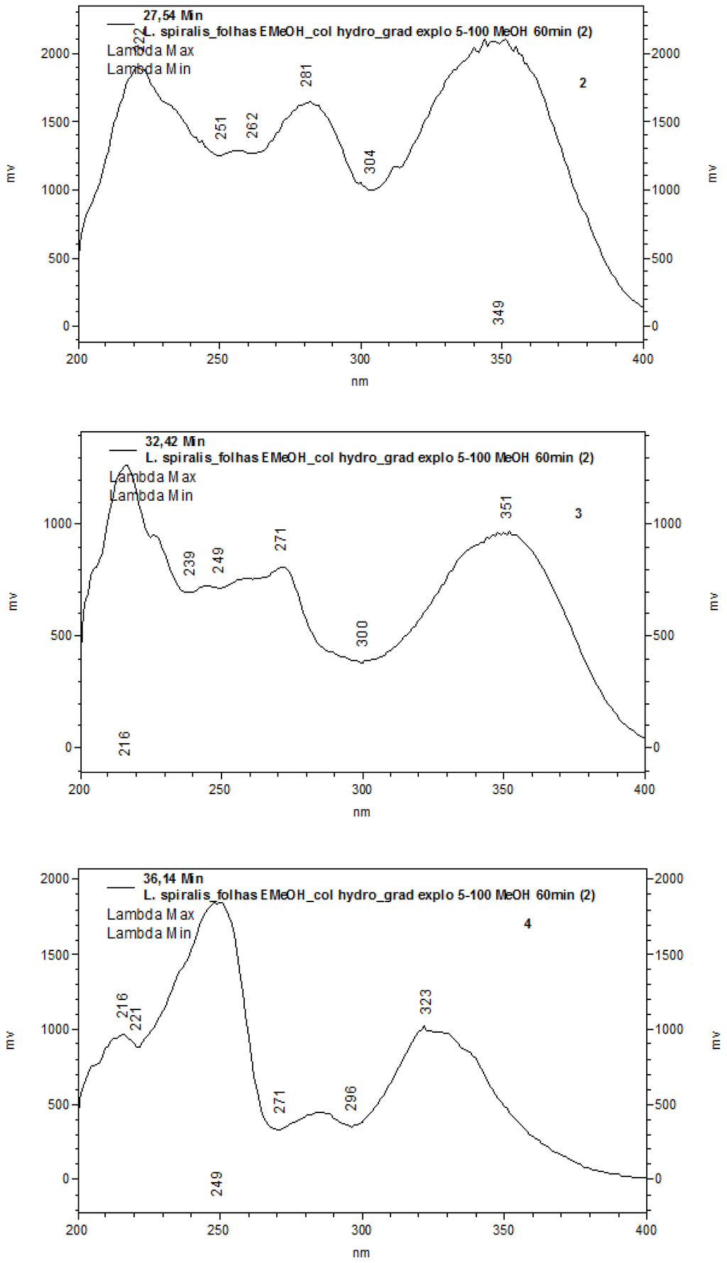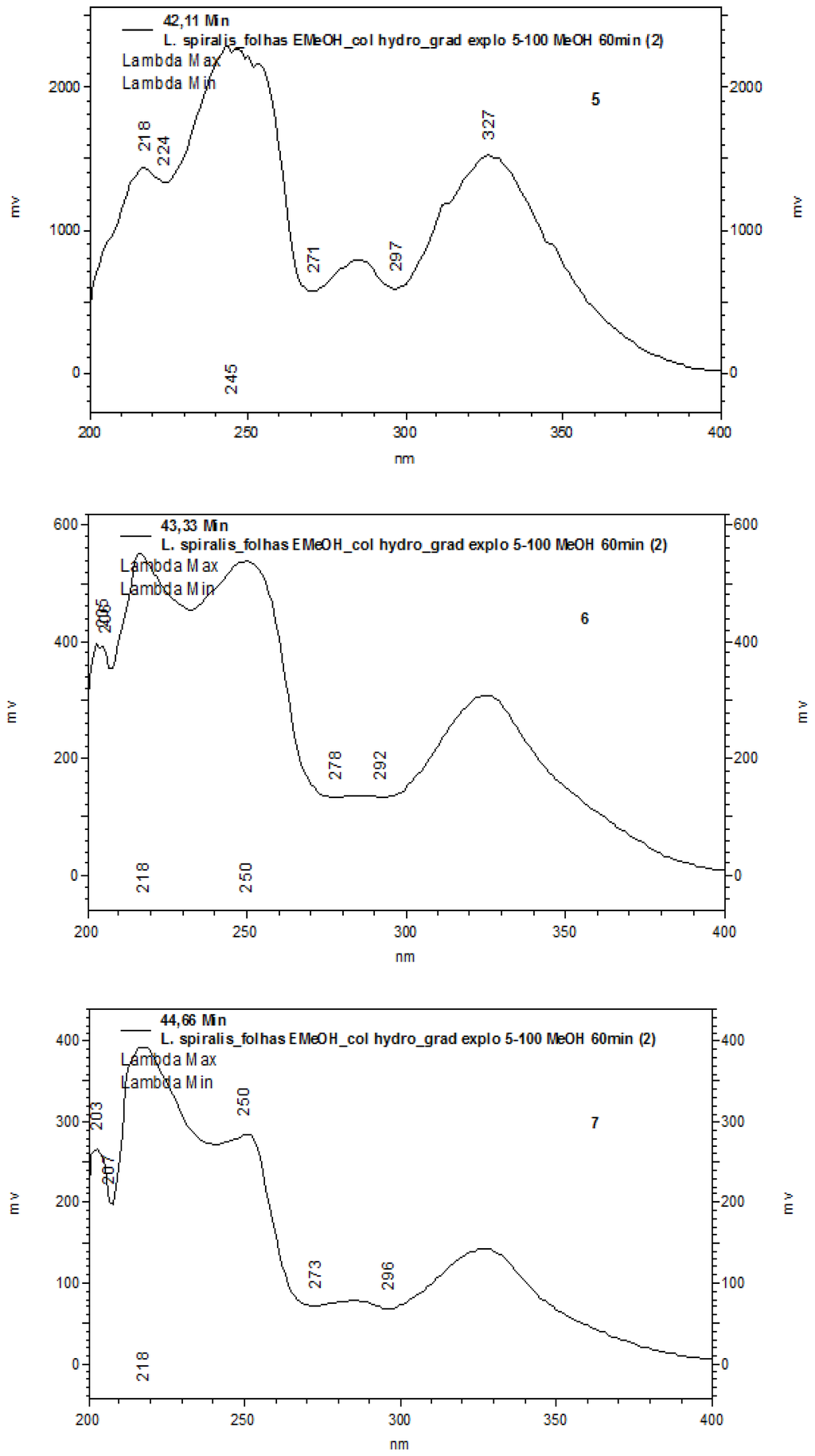 UV spectra of the chromatographic (HPLC) data of the methanolic extract of leaves from L. spiralis (peaks 1–7). Conditions: Phenomenex Synergi Hydro RP18 (250 × 4.6 mm i.d.; 4 μm) equipped with a Phenomenex security guard column (4.0 × 2.0 mm i.d.). The mobile phase composition was methanol. The gradient program was as follows: 5%–100% MeOH in 60 min. The flow rate was 1.0 mL/min and the total run time was 60 min.
