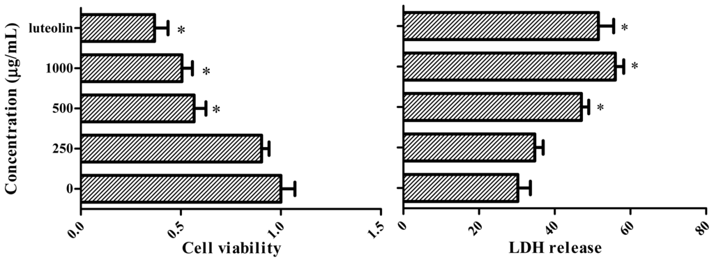 Effect of extract on cell viability and LDH release in cultured HeLa cells. Cells were treated with different concentrations of extract, and luteolin (31 mg/L) was used as positive control.* Significantly different from the basal conditions.