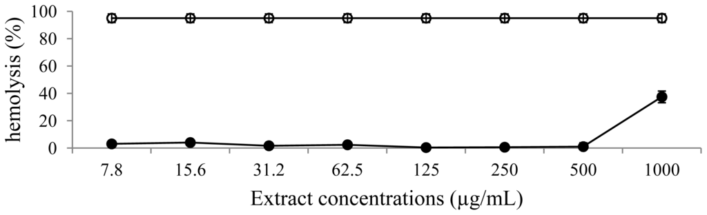 Hemolytic activity of extract of leaves of L. spiralis. Extract (filled circle) and positive control Triton X-100 (open circle).