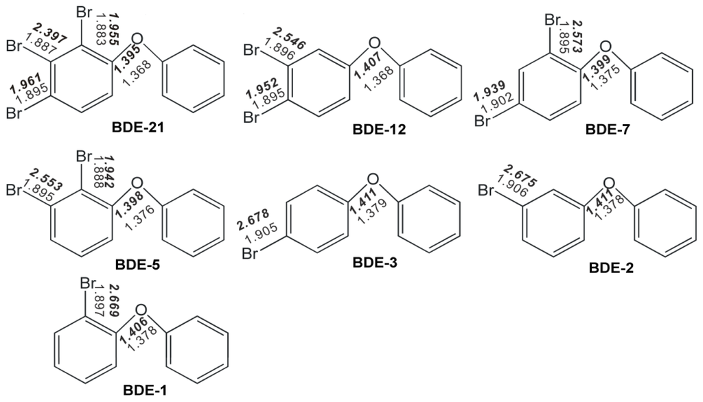 PBDEs are chemically stable in general, however the reactivity of their congeners or in different substituted position may vary considerably [18,19]. Since experimental determination on debromination of all 209 PBDE congeners is an expensive job, generally low cost theoretical evaluation becomes a convenient assistant method based on the limited experimental data available [19,20]. Recently, debromination pathways and kinetics of PBDEs with nZVI were reported by Zhuang et al. for 2,3,4-tribromodiphenyl ether (BDE-21), which has one bromine at each of the ortho-, meta-, and para-positions on one side of diphenyl ether, and its daughter debromination products [13]. To better understand this reaction, in this paper we selected for study all seven BDE congeners involved in Reference [13]: 2-monobromodiphenyl ether (BDE-1), 3-monobromodiphenyl ether (BDE-2), 4-monobromodiphenyl ether (BDE-3), 2,3-dibromodiphenyl ether (BDE-5), 2,4-dibromodiphenyl ether (BDE-7), 3,4-dibromodiphenyl ether (BDE-12) and BDE-21. The geometries for these BDE congeners were investigated at the density functional theory (DFT) level and the same calculations were also performed for their anionic forms. Prediction of the dominant debromination products based on the elongated C–Br bond in the obtained equilibrium structures of anionic PBDEs were used to compare with the reported experimental results. In addition, frontier orbital energies and adiabatic electronic affinities of the selected BDE congeners were also investigated, and employed for correlation study with their reaction rate constant for the debromination by nZVI.