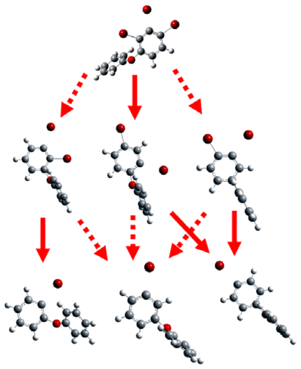 Visualized geometries (directly from GaussView 4.1) of the selected anionic BDE congeners optimized at the B3LYP/6-31+G(d) level and the proposed debromination pathway in this study (broader arrows indicate major pathways).