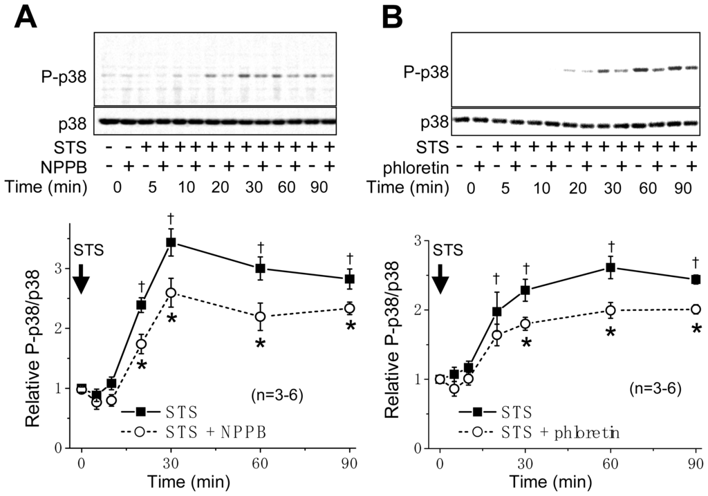 Sensitivity of STS-induced phosphorylation of p38 to a VSOR blocker, NPPB or phloretin, in HeLa cells. Top panels: Western blot analysis for time-dependent changes in the levels of phosphorylated p38 (P-p38) and non-phosphorylated p38 (p38) in the absence (−) or presence (+) of 200 μM NPPB (A) or 100 μM phloretin (B) without or with STS (4 μM) stimulation. Bottom panels: Time course of the ratio of P-p38 to p38 after STS stimulation in the absence (filled squares) or presence (open circles) of 200 μM NPPB (A) or 100 μM phloretin (B). Each symbol represents the relative mean value (normalized by the mean value at time zero) with SEM (vertical bar) (n = 3–6). * p < 0.05 versus the data in the absence of a VSOR blocker at a given time. † p < 0.05 between the data in the absence of a VSOR blocker at time zero and at a given time.