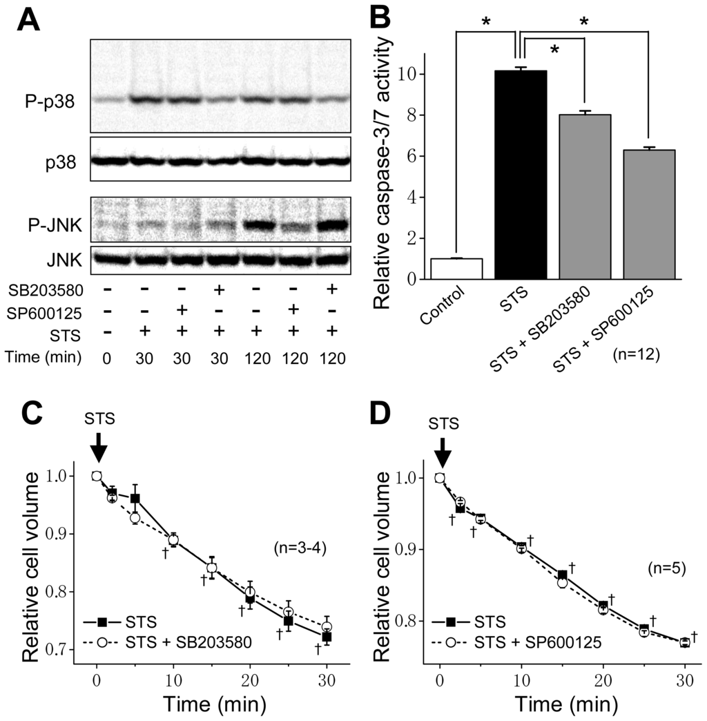 Effects of a MAPK inhibitor on STS-induced MAPK phosphorylation, caspase activity and AVD in HeLa cells. (A) Western blot analysis for the levels of P-p38, p38, P-JNK and JNK in the absence (−) or presence (+) of 10 μM SB203580 or 15 μM SP600125 30 min or 120 min after STS (4 μM) stimulation. (B) Caspase-3/7 activity before (Control: open column) or after 4-h stimulation with 4 μM STS in the absence (filled column) or presence of 10 μM SB203580 or 15 μM SP600125 (shadowed columns). Each column represents the relative mean value (normalized by the control value) with SEM (vertical bar) (n = 12). * p < 0.05 between two data designated. (C, D) Time course of changes in the mean cell volume after stimulation with 4 μM STS in the absence (filled squares) or presence (open circles) of 10 μM SB203580 (C) or 15 μM SP600125 (D). Each symbol represents the relative mean cell volume at a given time (normalized by the mean cell volume at time zero), and each vertical bar represents the SEM value (n = 3–5). † p < 0.05 between the data in the absence of a MAPK inhibitor at time zero and at a given time.