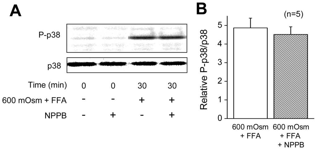 Since the above data suggest that AVD per se is a causal factor for activation of the stress-responsive MAPK cascade in HeLa cells, the effect of sustained cell shrinkage was next examined. The sustained cell shrinkage was induced by applying hypertonic stimulation (600 mOsmol/kg-H2O) in the presence of flufenamic acid (FFA), which blocks volume-regulatory hypertonicity-induced cation channel (HICC) thereby preventing the regulatory volume increase (RVI) [35,36]. Under hypertonic stress, addition of FFA resulted in more marked activation of caspase-3/7 after 4 h (Figure 6A) and a more prominent decrease in cell viability after 2 days (Figure 6B). Application of hypertonic stress together with FFA increased phosphorylation of p38 and JNK (Figure 6C,D), although FFA alone did not induce phosphorylation of p38 and JNK in the absence of hypertonic stimulation up to 180 min after application (data not shown). Phosphorylation of p38 and JNK was positively correlated with increases in osmolarity (Figure 6C,D). These results are in agreement with previous observations of these stress-responsive MAPK activation in association with osmotic shrinkage in a variety of cell types [37]. Moreover, hypertonicity-induced p38 phosphorylation was not significantly affected by a VSOR blocker (200 μM NPPB), as shown in Figure 7, consistently with a known fact that hypertonicity-induced cell shrinkage is a physical event without involving any volume-sensitive ion channels such as VSOR. These data indicate that the sustained cell shrinkage per se induces activation of the stress-responsive MAPKs.