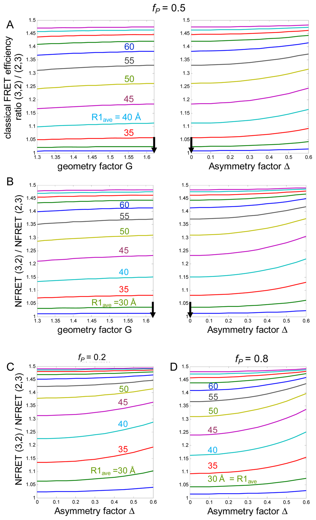 Simulations. (A) The y-axis is the simulated Ē3,2 / Ē2,3, the ratio of classical FRET efficiency for the two stoichiometries. The vertical arrows give parameters associated with the regular pentagonal receptor. The theoretical curves are computed for various values of the average distance between fluorophores on adjacent subunits R1,ave. X-axes are (left) the geometry factor G, and (right) the asymmetry factor Δ. The assumed fP = 0.5; (B) Same parameters as in (A); the plotted values are NFRET3,2/NFRET2,3, the ratio of NFRET efficiency for the two stoichiometries; (C) (D) Values of NFRET3,2/NFRET2,3 vs. asymmetry factor Δ for assumed fP = 0.2 (C) or 0.8 (D).