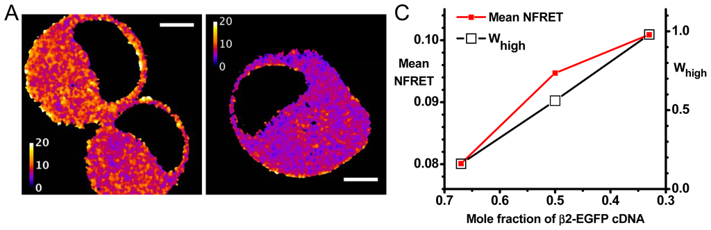 Cells transfected with a mole fraction of 0.5 β2-EGFP cDNA subunits and 0.5 α4-mCherry showed a nearly equal proportion of high and low NFRET distributions (Whigh = 0.56). For cells expressing 0.67 and 0.33 mole fraction of β2-EGFP cDNA, Whigh was 0.16 and >0.98 respectively (Figure 2). While there is no straightforward way to provide error estimates for Whigh, note that we require a coefficient of determination value of 0.995 to accept the number of components (one or two) in the fitted distributions [6,27]. The idea that a pure (α4)3(β2)2 population forms more readily than a pure (α4)2(β2)3 population agrees with recent data from stably transfected cell lines [34]. Thus we conclude that Whigh increases monotonically, but perhaps not linearly, with the fraction of (α4)3(β2)2 stoichiometry. Therefore changes in Whigh denote changes in the fraction of α4β2 nAChRs with the two stoichiometries.