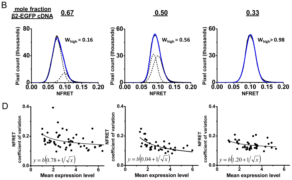 NFRET serves well to compare data among cells with varying expression levels. Nonetheless, a cell with a higher expression level is expected to provide a less noisy overall estimate of FRET. Suppose that the number of nAChR molecules undergoing FRET in a given pixel is a uniformly distributed random variable whose mean varies among cells. (A cell is also a collection of compartments that may have their own means; NFRET in intracellular compartments has been reported separately [27]). Measurements from a uniformly distributed collection of molecules are expected to have standard deviation proportional to the square root of the average number of molecules. In this paper, we extend the previous analyses by comparing the distributions across cells by plotting the coefficient of variation (CV) of the NFRET signal vs. the expression level. We approximated the expression level within a cell by taking either its mean net FRET or its mean normalization value (denominator in Equation 8); results were similar for the two metrics, and the second is presented in Figure 3D. In the data for 0.5 mole fraction β2-EGFP cDNA, we found that the CV varies as the −0.48 power of expression level, which is near the expected inverse square-root relation. Figure 4D displays further analyses for mole fractions of 0.33, 0.5, and 0.67 β2-EGFP cDNA. We fitted the distributions to the sum of a constant term and an inverse square-root term,