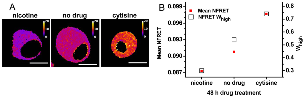 Data from NFRET measurements with pharmacological chaperones. Further analysis of a published experiment [27]. (A) NFRET images for representative cells transfected with 0.5 mole fraction plasmid ratios of β2-EGFP and α4-mCherry. Incubation for 48 h in 0.1 μM nicotine (left), no added drug (center), and 0.1 μM cytisine (right). The lookup table runs from 0 to 0.2 fractional NFRET. Scale bars, 10 μm; (B) Average NFRET and Whigh for each incubation, from data like those of Figure 1B. The left y-axis gives mean NFRET. The standard errors of the mean are much smaller than the size of symbols, because each sample had >106 pixels. The right y-axis is Whigh.