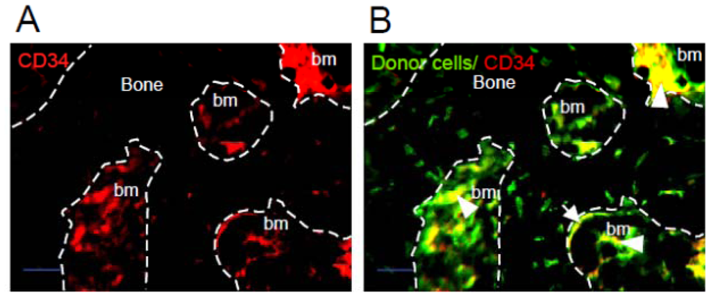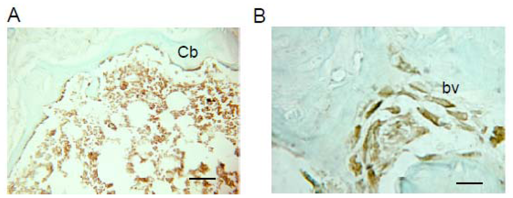 In our previous study [14], we showed that ~18% of cells in the HipOP fraction of bone marrow stromal cells are CD34-positive by flow cytometry, and we speculated that they were hematopietic cells. We now show by immunohistochemistry that CD34-positive cells are localized throughout the tissue reconstituted by HipOPs in transplants including not only cells within the bone marrow but, unexpectedly, also in osteoblast-like and lining cells along the bone surface and in other areas, including around blood vessels. This suggests that CD34 expression appears not to be limited to hematopietic cells but rather is also expressed in other cell types, including cells along bone surfaces and elsewhere, indicating that it is not an unequivocal marker of either hematopoietic or mesenchymal progenitors including MSCs but requires other markers to be used concomitantly for cell identification in mouse.