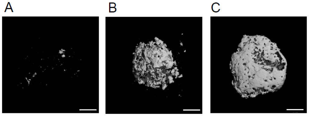 MicroCT 3D reconstructions of typical transplants of HipOPs at 8 weeks after transplantation. (a) 2.5 × 105 transplanted cells; (b) 1.0 × 106 transplanted cells; (c) 2.0 × 106 transplanted cells, bars = 1 mm.