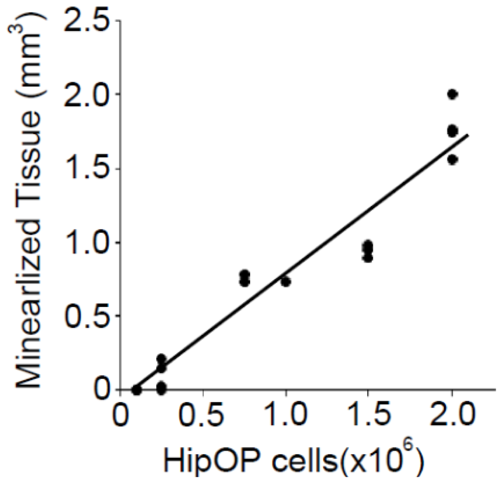 The relationship between the total mineralized tissue volume produced by HipOPs and the transplanted number of HipOPs.