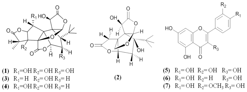 The seven chemical standards ginkgolide C (1), bilobalide (2), ginkgolide A (3), ginkgolide B (4), quercetin (5), kaempferol (6), and isorhamnetin (7) were previously isolated from G. biloba leaves in our laboratory. Their structures were determined by 1H-NMR, 13C-NMR, MS and UV spectra (purities > 98%). Each reference compound was precisely weighed and dissolved in methanol as stock solution. The chemical structures of these reference compounds are shown in Figure 1. Methanol was HPLC-grade from Merck (Darmstadt, Germany) and deionized water was purified by an EPED superpurification system (Eped, Nanjing, China). Other reagent solutions were of analytical grade (Nanjing Chemical Plant, Nanjing, China).