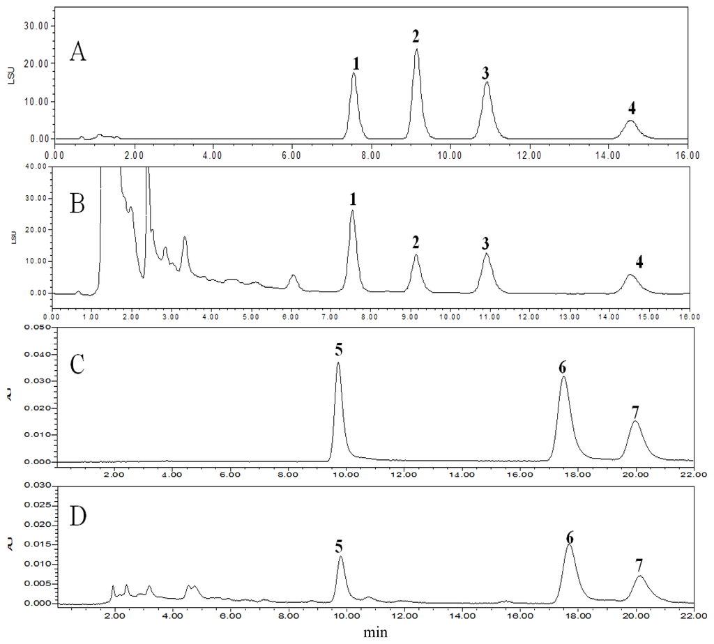 HPLC-ELSD chromatograms of a mixture of terpene lactones standards (A), a sample of G. biloba leaves (B), HPLC-PDA chromatograms of a mixture of flavonol aglycones standards (C) and a sample of G. biloba leaves (D) recorded at 360 nm. (1) ginkgolide C; (2) bilobalide; (3) ginkgolide A; (4) ginkgolide B; (5) quercetin; (6) kaempferol; (7) isorhamnetin.