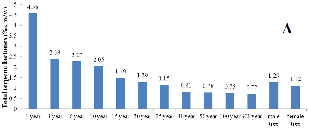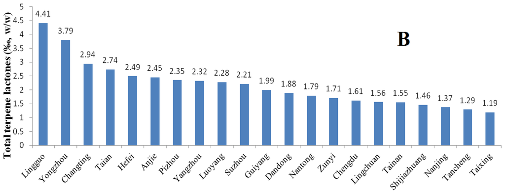 The results (Figures 3 and 4) indicate that the contents of the total terpene lactones and flavonol glycosides in G. biloba leaves are the highest in trees of 1~3 years of age and distinct in different cultivation sources. And it was also found that their contents in leaves of male G. biloba is higher than in female trees (Figures 3 and 4). The sample from Ningguo contained the highest total terpene lactones and the Taixing contained the lowest. The flavonol glycosides were highest in samples from Anji, while they were lowest in samples from Taixing. The contents of the total terpene lactones in samples from Ningguo, Yongzhou, Changting and Taian were higher than the standards of PPRC; and the contents of the flavonol glycosides in samples from Anji, Nanjing, zunyi, Nantong, Luoyang, Lingguo, Chengdu and Changting were higher than the standards of PPRC, which indicated that the samples from Lingguo and Changting were possibly suitable for application as standard G. biloba leaves. And the results show that geographical factors have a significant influence on the biosynthesis of terpene lactones and flavonol glycosides in G. biloba leaves.