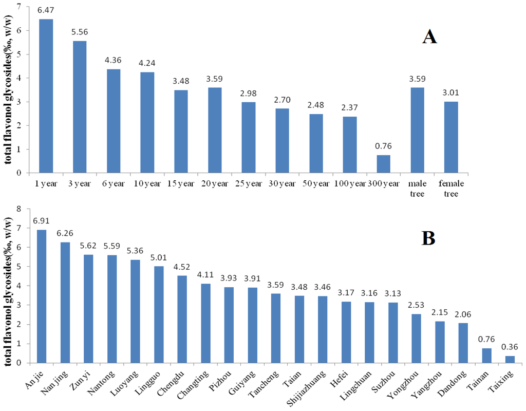Comparison of the total flavonol glycosides in the G. biloba leaves collected from different ages (A), cultivation sources (B) and genders (A).