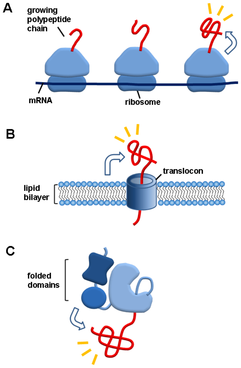 - Fedorov, A.N.; Baldwin, T.O. Cotranslational protein folding. J. Biol. Chem 1997, 272, 32715–32718. [Google Scholar]