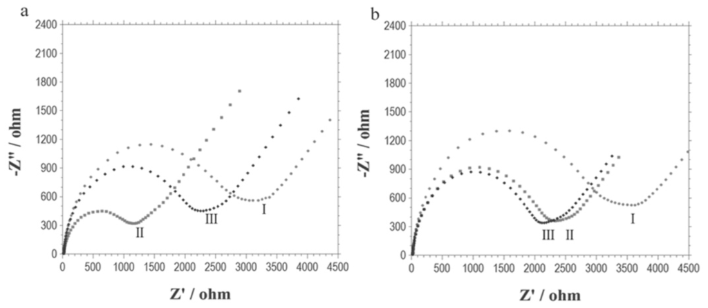 Electrochemical impedance spectra (Nyquist plots) of the DNA modified electrode (I) before and (II) after its incubation with (a) 22Rv1 cells which were treated with both 100 μM iRGD and 50 μM doxorubicin, or (b) 50 μM doxorubicin. Curve (III) is the case of further treatment with cell lysis buffer; Test solution: 1 M KNO3 containing 5 mM Fe(CN)63−/4−. Biasing potential: 0.222 V. Amplitude: 5 mV. Frequency range: 0.1 Hz to 100 kHz.