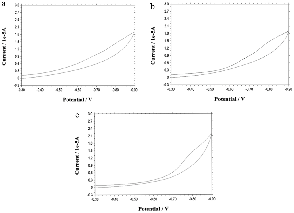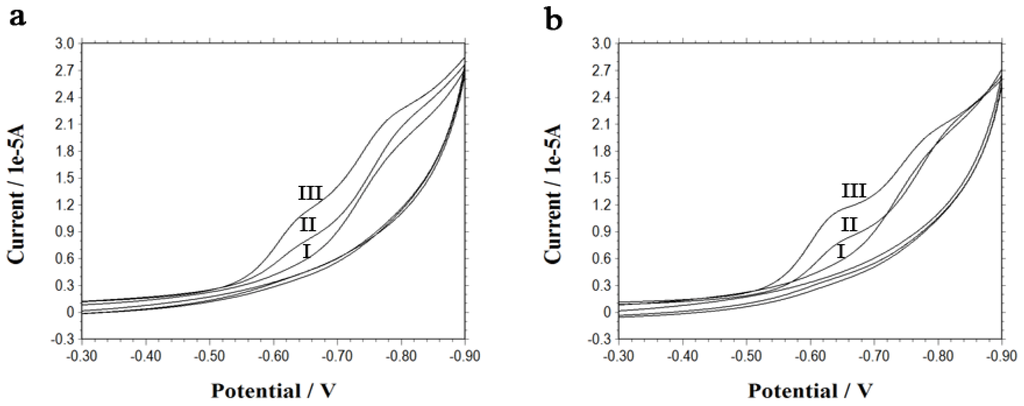 Cyclic voltammetry (CV) was employed to investigate the electrical communication between the gold electrode and the electroactive species inside the cells. Figure 2a presents a reduction peak appearing at −0.64 V which is attributable to the reduction of quinone in doxorubicin [15,16]. The peak appears only after the incubation of the electrode with the cell suspension pretreated by iRGD, and the peak current is directly proportional to the concentration of iRGD if the concentration of doxorubicin remains unchanged. The results reveal that iRGD peptide has indeed enhanced the cell penetration, thus the enhancement of the cell penetration caused by iRGD improves the uptake of both DNA molecules modified on the electrode and doxorubicin, the electroactive drug molecule. With more iRGD acting on cells, more doxorubicin molecules enter into the cells and transfer their redox reactions out through DNA chains. Thus a higher electrochemical signal is obtained.