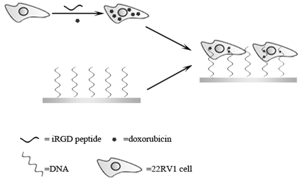 The strategy for electrical communication between the inner part of cells and the electrode is schematically depicted in Scheme 1. Firstly, DNA molecules rich in CpG sequences are immobilized on a gold electrode. Then the electrode is immersed in the cell suspension which has been pretreated with iRGD and doxorubicin. In this process, the enhanced cell penetration by iRGD will promote the uptake of not only doxorubicin but also DNA molecules, one end of which has been modified on the electrode, in the cells. Since doxorubicin inside the cells will bind to DNA chains by electrostatic interaction, electron transfer from the redox species inside the cells across the cell membrane to the electrode can be achieved.