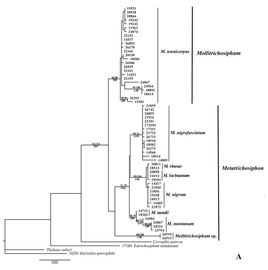 The monophyly of the genus Mollitrichosiphum was supported by phylogenetic analyses based on different approaches and genes (Figure 1). The phylogenetic trees of the combined dataset supported the division of the two subgenera (Mollitrichosiphum and Metatrichosiphon) based on morphological characters [24,25]. The molecular phylogenetic relationships between the species were also supported by morphological characters, such as the ultimate rostral segments of M. luchuanum, M. rhusae and M. nigrum, which are at least twice the length of the second hind tarsal segment, while the ultimate rostral segment of M. nandii and M. montanum are not more than twice the length of the second hind tarsal segment.
