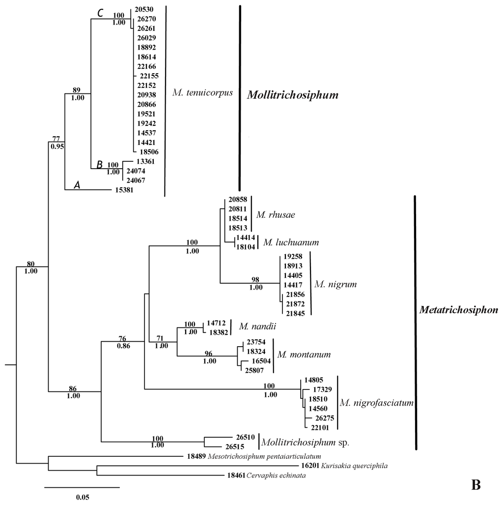 Phylogenetic relationships of Mollitichosiphum species based on Maximum likelihood analysis of the EF-1α sequences (A) and combined dataset of Cytochrome C Oxidase Subunit I (COI), Cytochrome b (Cytb) and Elongation Factor-1α (EF-1α) sequences (B). Bootstrap values (≥50%) for maximum parsimony (MP), maximum likelihood (ML) are shown above the branches, Bayesian posterior probabilities (≥50%) are shown below the branches. In Figure 1B, italic scripts of A, B and C represent the three clades in M. tenuicorpus.