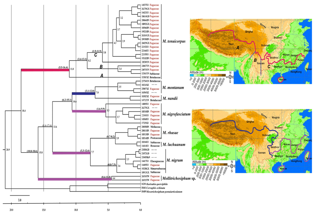 A chronogram of the Chinese Mollitrichosiphum species based on the combined COI and Cytb genes. Median age estimates are shown behind nodes (mya). Italic scripts of A, B and C represent three clades in M. tenuicorpus. Clades were marked with colours corresponding to the distributions of samples, and colour boundaries indicate the distribution ranges of clades. Host plant information was given following the sample names, with Fagaceae indicated in red, “--” represents host plants that are unknown. Locality abbreviated in capital letters: XZ, Tibet; YN, Yunnan; HN, Hainan; GX, Guangxi; FJ, Fujian; GD, Guangdong; ZJ, Zhejiang; HuN, Hunan; SC, Sichuan.