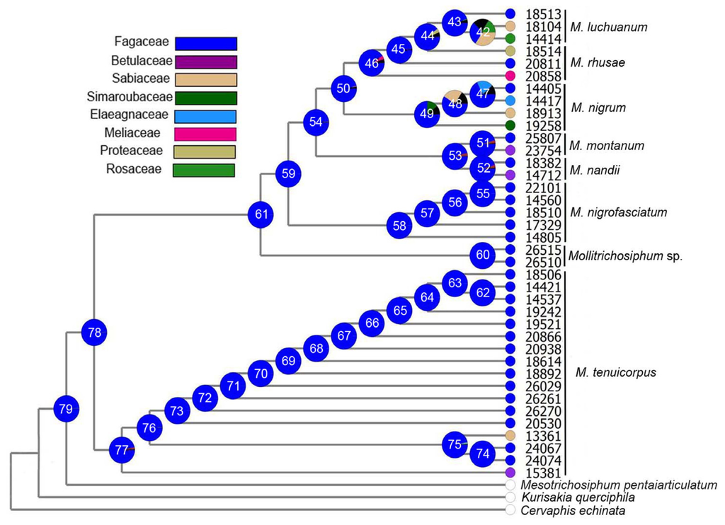 The results of ancestral state reconstruction suggest that Fagaceae was highly favored among all host plants. Node 61 and 77 (Figure 3), which are the MRCAs of the subgenus Metatrichosiphon and Mollitrichosiphum, showed high proportion of Fagaceae, 0.99 and 0.97, respectively; thereby the common ancestor of Mollitrichosiphum (node 78, 0.99) feeds on Fagaceae received strong support.