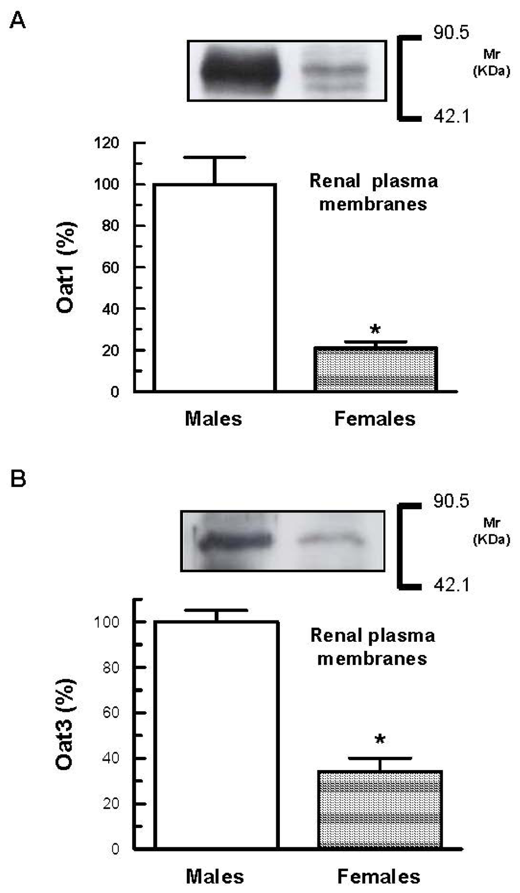 Western blotting for Oat1 (A) and for Oat3 (B) in plasma membranes (18 μg proteins) from kidneys of male and female rats. Proteins were separated by SDS-PAGE and blotted onto nitrocellulose membranes. The mean of the male levels were set as 100%. Each column represents the mean ± SEM from experiments carried out in four animals for each experimental group. * p < 0.05. Kaleidoscope Prestained Standards of molecular mass corresponding to bovine serum albumin (90.5 kDa) and to carbonic anhydrase (42.1 kDa) are indicated in the right of the figure.