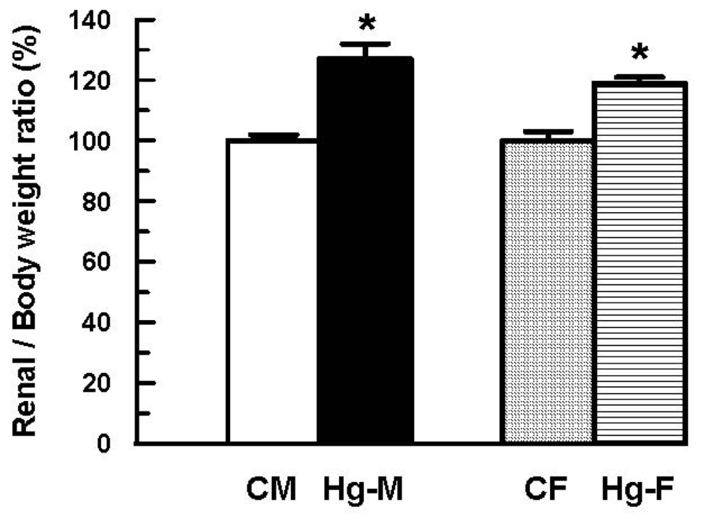 Effect of HgCl2 (4 mg/kg of body weight, i.p.) on the ratio of kidney weight to body weight in male and female rats 18 h after treatment. Each column represents the mean ± SEM from experiments carried out in four animals for each experimental group. * p < 0.05 vs. respective control. The mean of both control male and female levels were set as 100%. CM: Control Males; Hg-M: Hg-treated Males; CF: Control Females; Hg-F: Hg-treated Females.