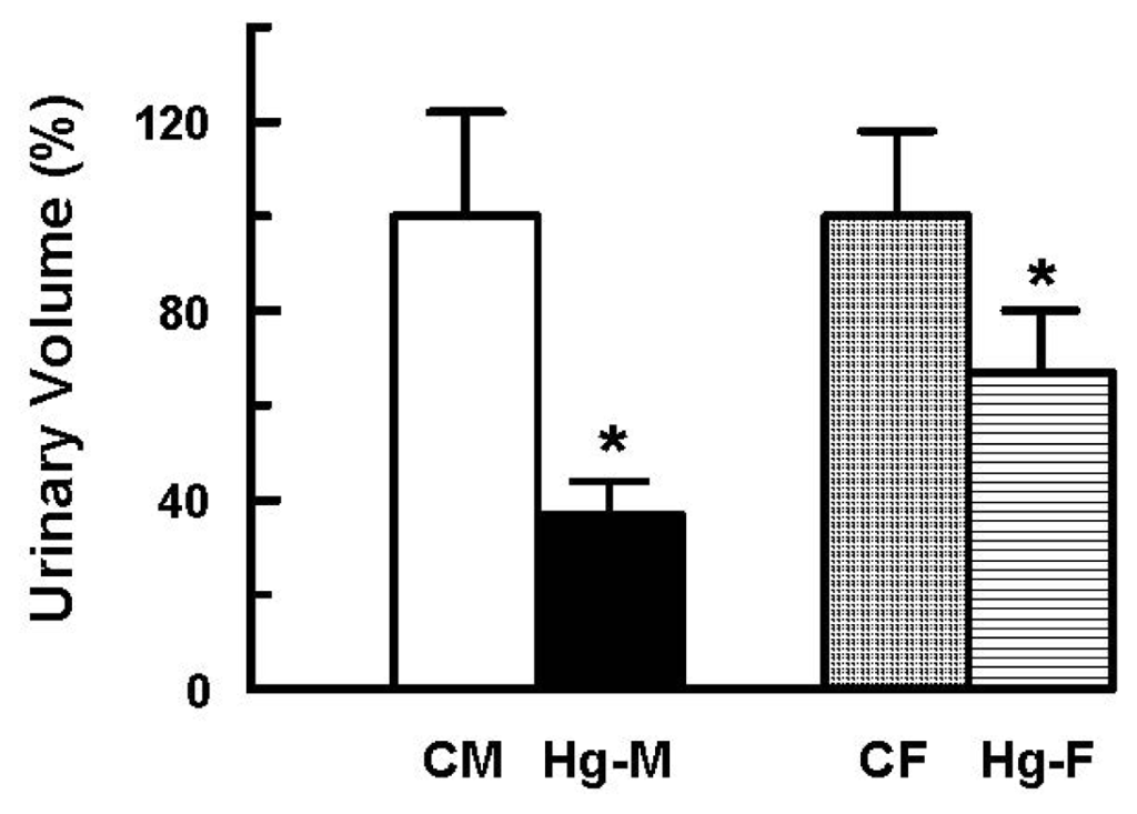 Effect of HgCl2 (4 mg/kg of body weight, i.p.) on the urinary volume in male and female rats 18 h after treatment. Each column represents the mean ± SEM from experiments carried out in four animals for each experimental group. * p < 0.05 vs. respective control. The mean of both control male and female levels were set as 100%. CM: Control Males; Hg-M: Hg-treated Males; CF: Control Females; Hg-F: Hg-treated Females.