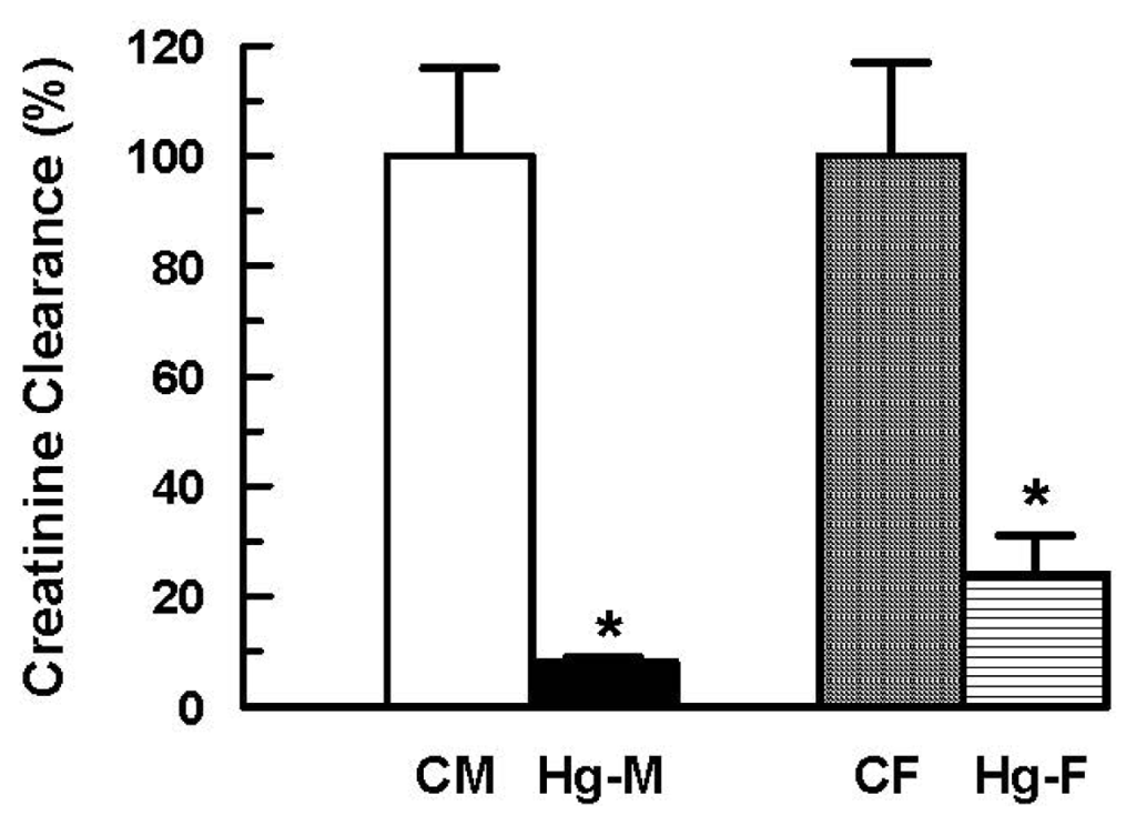 In addition, significant decreases in urinary volume and in creatinine clearance were observed in male and female rats following HgCl2 treatment (Figures 3 and 4). However, the decreases in HgCl2-treated females were much smaller than those observed in HgCl2-treated male rats.