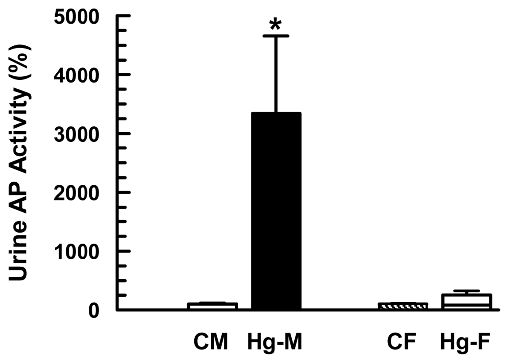 The urinary activity of AP has been widely used as a biomarker for renal injury [,]. Thus, the urinary activity of AP was measured, related to urinary creatinine concentrations. As shown in Figure 5, the activity of AP was only significantly increased in urine samples from HgCl2-treated male rats.