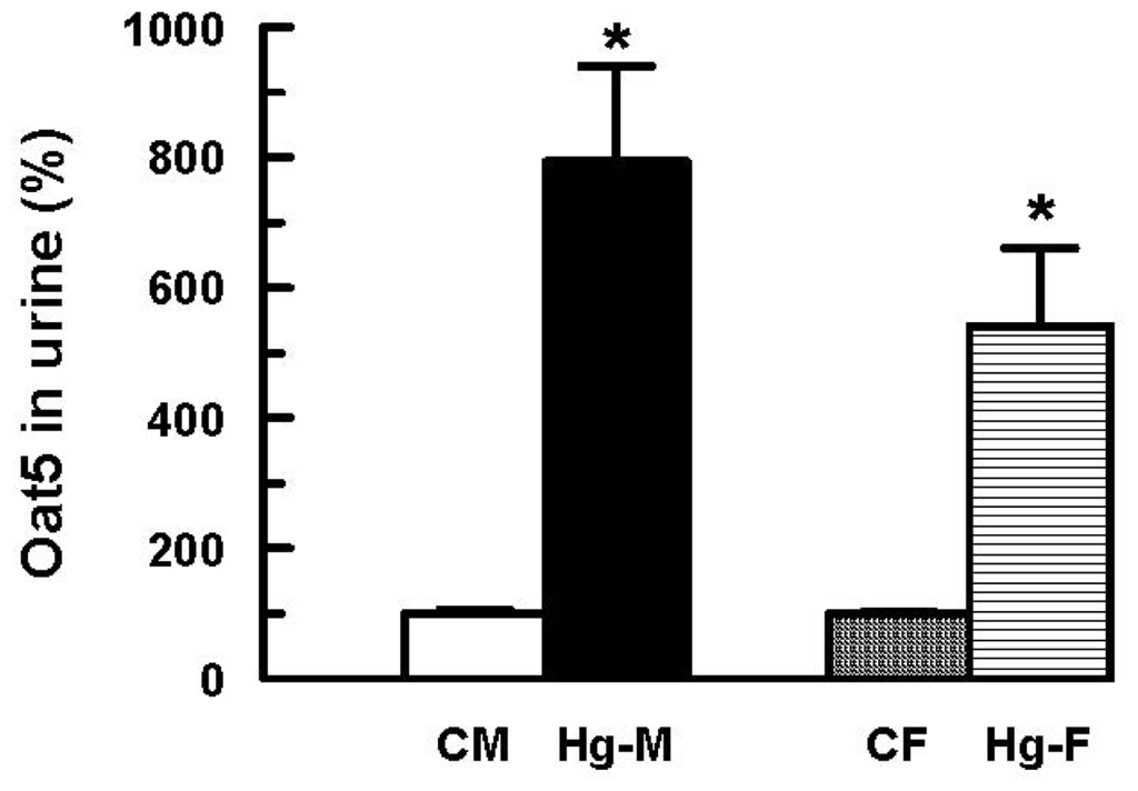 These gender differences in renal injury induced by mercury are striking and indicate that Oat1 and Oat3 are among the main transporters responsible for HgCl2-induced renal injury.