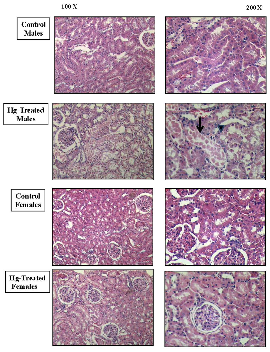 Histopathological damage as assessed by hematoxylin/eosin-stained kidney sections revealed a marked difference in the pattern of renal injury between male and female rats after HgCl2 treatment (Figure 7). The male kidneys showed some vacuolated cells, disrupted brush border membranes, cellular detachment, disrupted tubular basement membranes and necrosis as previously described [–].