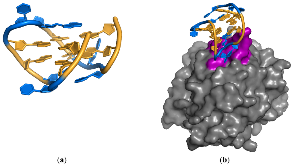 (a) Double G-quadruplex shown in gold, loops in blue; (b) Thrombin aptamer bound to exosite 1 (magenta) of thrombin (1HUT) [32].