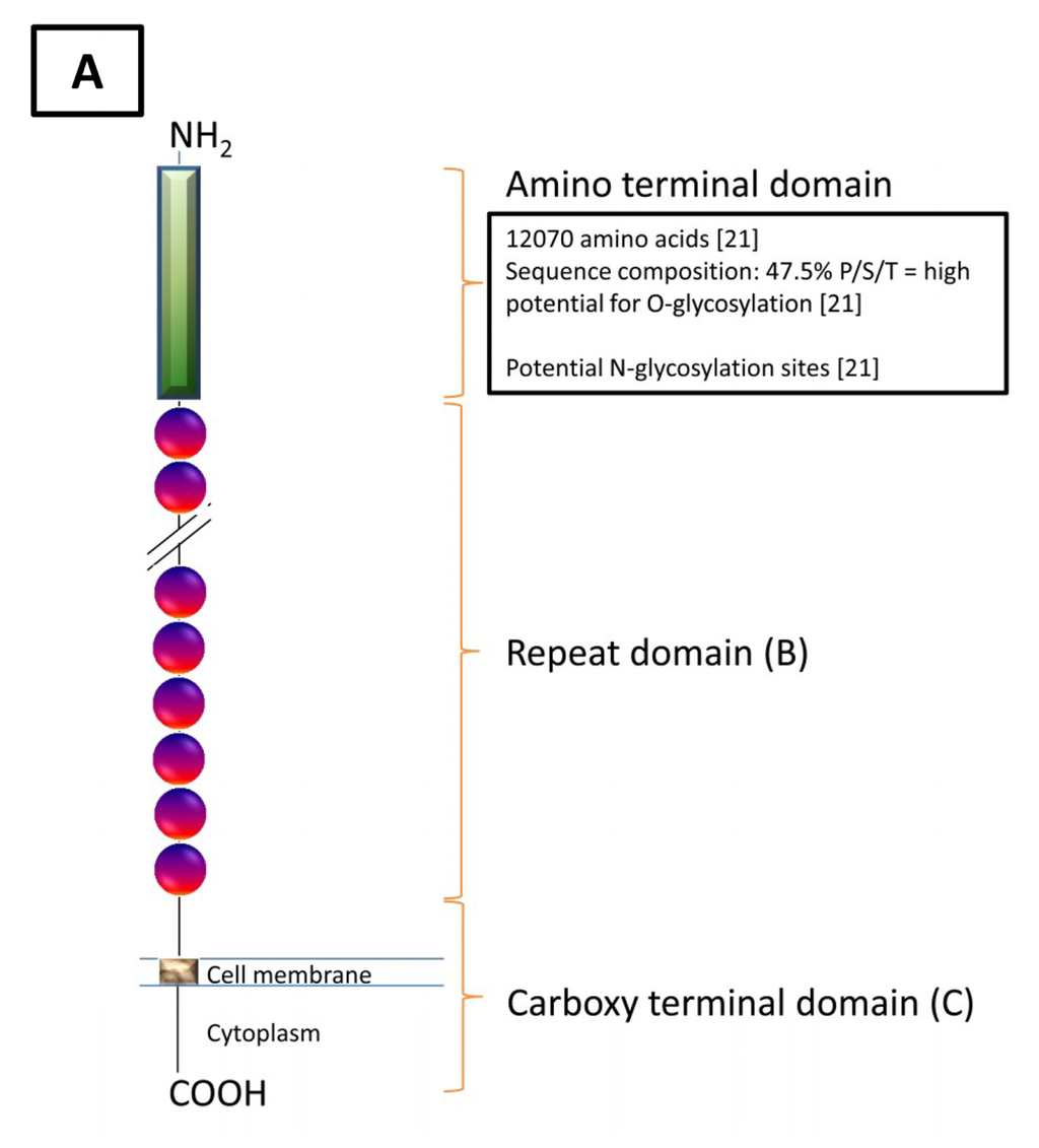 The amino terminus was first described as a 1637 amino acid domain coded by 5 exons [,]. This was later revised by O’Brien et al. where an additional 37,700 nucleotides were sequenced from chromosome 19 []. Acquisition of the complete amino domain was confirmed by the identification of a Kozak translational initiation sequence as well as supporting Northern blot and mRNA expression data []. The main feature of this domain is the abundance of serine and threonine residues, which represent many potential sites of O-glycosylation, and disperse asparagine residues as potential sites of N-glycosylation [].