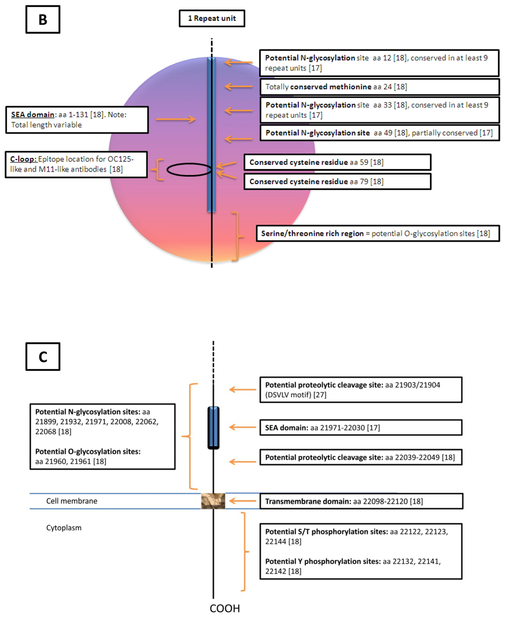 Schematic of CA125. (A) A diagrammatic overview of the molecular structure of CA125 as described by O’Brien et al. [,]; (B) A typical repeat unit of 156 amino acids and the possible features assigned to this sequence. At least 60 repeats have been identified, of which 45 are unique sequences, giving rise to a minimum domain length of 9800 aa []. Serine/Threonine rich region downstream of SEA domain was unspecified [], O-glycosylation potential of a randomly chosen repeat unit (aa 14,255–14,410) was determined by submission to NetOGlyc 3.1 Server [] (aa 131–156); (C) Carboxy terminal domain: aa 21,869–22,152 (length: 284 aa) [] (aa numbering according to UniProt []).