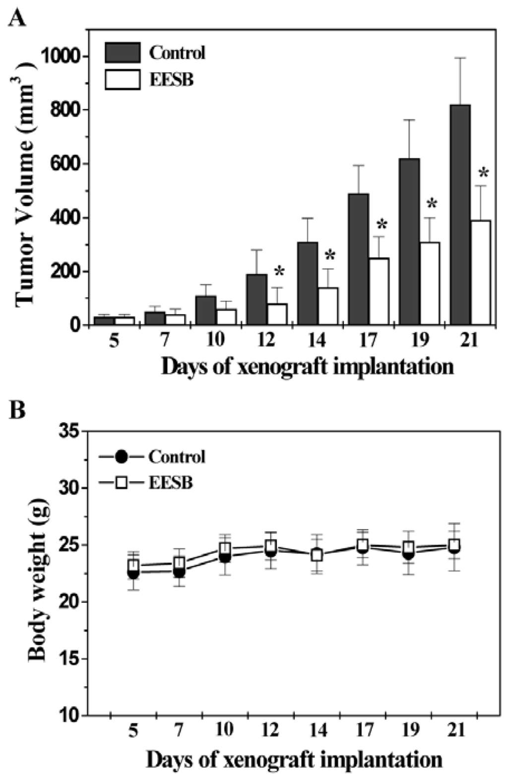 The in vivo efficacy of EESB against tumor growth was investigated by evaluating its effect on tumor volume in CRC xenograft mice, and its adverse effect was determined by measuring the body weight gain. As shown in Figure 1A, administration of EESB significantly decreased tumor weight in a time-dependent manner as compared with the control group (p < 0.05). In addition, EESB treatment did not affect animal body weight (Figure 1B). These data together suggest that EESB is potent in suppressing colon tumor growth in vivo, without apparent adverse effects.